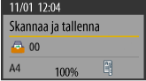 Näyttää kohteiden määrän, kohteen*1, alkuperäiskappaleen koon, tarkkuuden ja kaksipuoleisuuden asetukset.