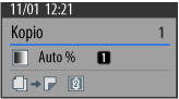 Näyttää seuraavat tiedot: kopiomäärä, kopiosuhde, paperilähde, kaksipuolinen sekä N 1:lle- ja nidonta-asetukset (viimeistelijällä varustettu malli).