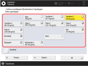 Kun usein käytetyn paperin tiedot (koko ja tyyppi) tallennetaan suosikkipaperiksi, nämä tiedot voi hakea paperiasetusten näytöltä ja paperikoon ja -tyypin voi määrittää nopeammin.