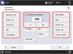 Kun valitset [Aut.], valitse paperikoko kopiointisuhteen märittämistä varten ja paina sitten [OK]. Kopiointisuhde asetetaan automaattisesti kohdassa [Valitse paperi] valitun paperikoon perusteella.