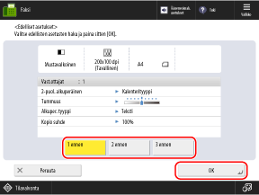 Esimerkiksi skannattaessa kaksipuolista alkuperäiskappaletta yksipuolisen alkuperäiskappaleen skannaamisen jälkeen paina [Muuta asetuksia] ja määritä asetus [2-puol. alkuperäinen].