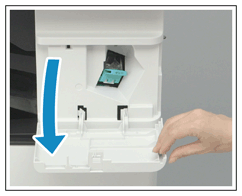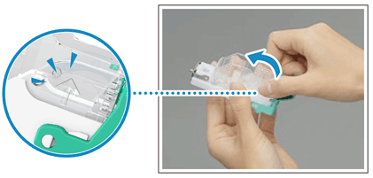 Pidä kiinni niittikasetin vihreästä ulokkeesta ja työnnä sitä sisään niin syvälle kuin se menee.