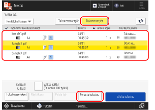 Jos tulostusnäyttö tulee näkyviin, paina [Tulostetut työt], valitse peruutettava työ tulostustöiden luettelosta ja paina [Peruuta tulostus].
