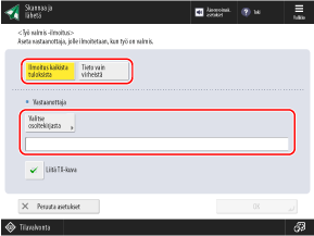 Voit valita vastaanottajan ilmoitukselle osoitekirjasta (pois lukien kohteet henkilökohtaisesta osoiteluettelosta tai käyttäjäryhmän osoiteluettelosta) tai antamalla kirjautumiseen määritetyn käyttäjän sähköpostiosoitteen.