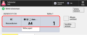 Näkymän keskellä näkyvät tiedot käytettävästä paperista ja tulosteiden määrästä. Tarkista nämä asetukset oikean tulostuksen varmistamiseksi.
