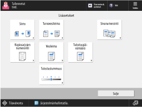 Määritä yksityiskohtaiset tulostusasetukset painamalla tämän näytön painikkeita. Kun olet määrittänyt tulostusasetukset, palaa tulostusasetusten näyttöön painamalla [Sulje].