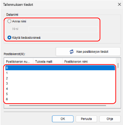 Määritä tallennettavan tiedoston nimi ja tallennussijantina käytettävä postilokero.