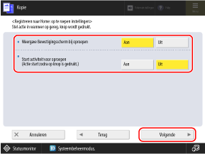 Stel [Weergave Bevestigingsscherm bij oproepen] in op [Uit] en stel [Start activiteit voor oproepen] in op [Aan].