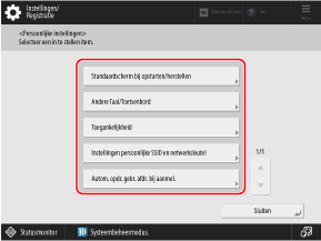 U kunt de instellingen (persoonlijke instellingen) met betrekking tot de schermweergave en de bedienbaarheid voor elke ingelogde gebruiker wijzigen. Deze instellingen zijn alleen geldig wanneer de gebruiker die ze aangepast heeft, ingelogd is en hebben geen invloed op de instellingen van andere gebruikers.