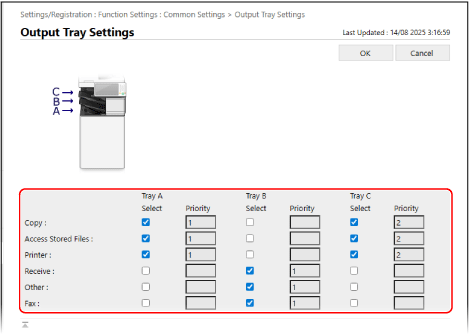 U kunt ook meerdere uitvoerladen voor elke functie opgeven en de prioriteit opgeven. In dit geval schakelt de uitvoerbestemming automatisch over naar een lade met een lagere prioriteit wanneer het opvangblad met de hoogste prioriteit de capaciteit bereikt.