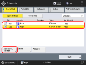 * Als de huidige kopieer- of afdrukbewerking een onderbrekingsopdracht is, start de geselecteerde gereserveerde kopieeropdracht nadat de huidige onderbrekingsopdracht is voltooid.