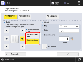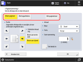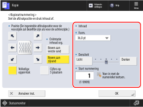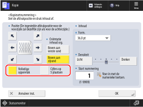 *U kunt [Volledige oppervlak] en [Cijfers op 5 plaatsen] niet selecteren als de instellingen zijn geconfigureerd om andere informatie toe te voegen aan de nummers van de kopieerset.