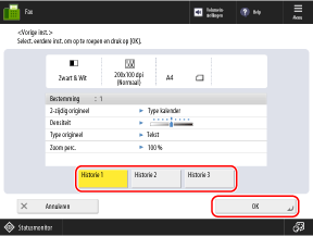 Op het scherm [Vorige instellingen] selecteert u de geschiedenis die u wilt oproepen en drukt u op [OK].