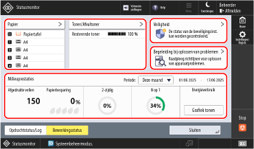U kunt een scherm weergeven om de status van meerdere opties tegelijk te controleren, zoals de resterende hoeveelheid papier en toner, de status van de beveiligingsmaatregelen van de machine, ondersteuningsinformatie voor het oplossen van problemen tijdens faxen en afdrukken, en de afdrukopdrachtstatus en het energieverbruik binnen een opgegeven tijdsperiode.