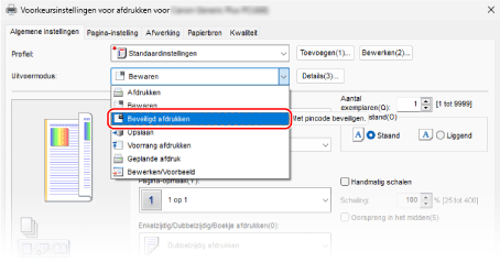 Selecteer [Beveiligd afdrukken] voor [Uitvoermodus].