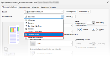 Selecteer [Geplande afdruk] voor [Uitvoermodus].