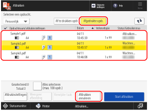 Als [Lijst afdrukopdracht] wordt weergegeven, selecteert u de te annuleren opdracht in de lijst met afdrukopdrachten en drukt u op [Annuleren].