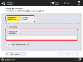U kunt een bestemming die in het adresboek is geregistreerd (met uitzondering van bestemmingen in een persoonlijke adreslijst of een adreslijst van een gebruikersgroep) of een e-mailadres van een aangemelde gebruiker instellen als de bestemming van meldingen.