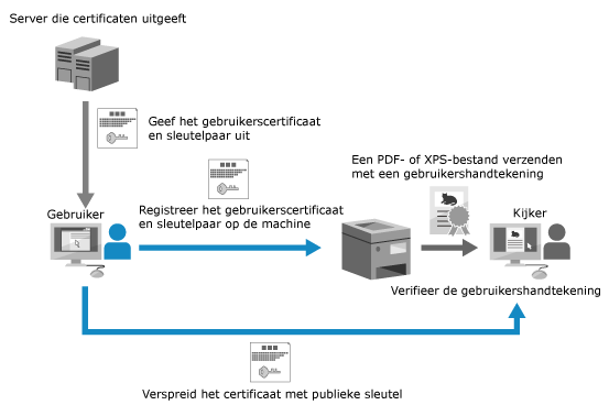 U kunt de sleutel en het certificaat (gebruikerscertificaat) die u voor de gebruikershandtekening wilt gebruiken op de machine registreren en het certificaat met de openbare sleutel naar de kijker sturen. Nadat u de sleutel en het certificaat hebt geregistreerd, kunt u de gebruikersnaam als handtekening toevoegen aan een gescand document.