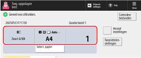 Het momenteel ingestelde papier en het aantal afdrukken worden in het midden van het scherm getoond. Controleer deze instellingen om te waarborgen dat er correct wordt afgedrukt.