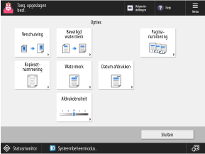 Druk op de knoppen op dit scherm om de gedetailleerde afdrukinstellingen te configureren. Druk na het configureren van de afdrukinstellingen op [Sluiten] om terug te gaan naar het scherm met afdrukinstellingen.