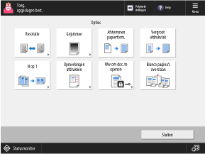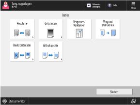 Druk op de knoppen op dit scherm om de gedetailleerde afdrukinstellingen te configureren. Druk na het configureren van de afdrukinstellingen op [Sluiten] om terug te gaan naar het scherm met afdrukinstellingen.
