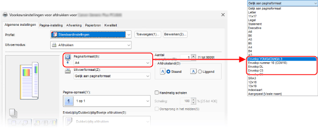 In [Paginaformaat] op het tabblad [Algemene instellingen] selecteer het formaat van de envelop.