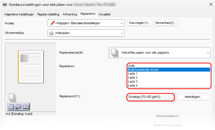 In [Papierbron] en [Papiersoort] op het tabblad [Papierbron], selecteer de multifunctionele lade en de envelop.