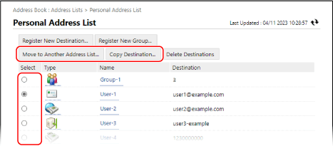 Wybierz miejsce docelowe do przeniesienia lub skopiowania i kliknij przycisk [Move to Another Address List] lub [Copy Destination].