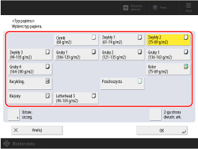 Aby ustawić niestandardowy zarejestrowany typ papieru, zarejestruj rozmiar i typ jako często używany papier, a następnie użyj opcji [Ulubiony papier], aby przywołać ten papier.