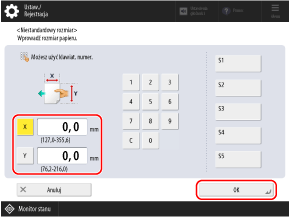 Jeśli zarejestrowane są często używane niestandardowe rozmiary, można je wywołać, naciskając [S1] do [S5].