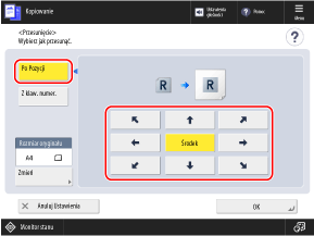 Naciśnij przycisk [Po Pozycji], a następnie naciśnij przycisk strzałki lub [Środek], aby określić kierunek przesunięcia oryginału.