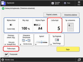 Na ekranie kopiowania wprowadź liczbę kopii i naciśnij [Próbna kopia].