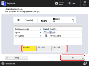 Przy wywołaniu historii ustawień określone ustawienia kopiowania zostaną nadpisane.