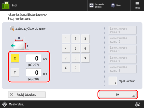 Naciśnij [Zapisz Rozmiar]  wybierz przycisk, do którego chcesz zarejestrować rozmiar  naciśnij [Zapisz/Edytuj]  wprowadź długości dla strony [X] i [Y] strona  naciśnij [OK]  [Zamknij]
