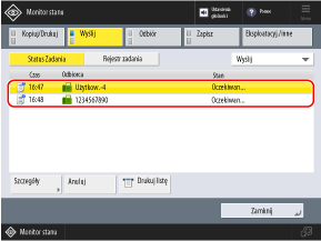 Gdy wyświetlane są statusy wysyłania, można nacisnąć [Drukuj listę], aby wydrukować listę statusów wysyłania.