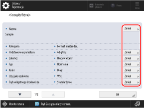 Można nacisnąć [Zmień] dla każdej pozycji, aby zmienić informacje o typie papieru.