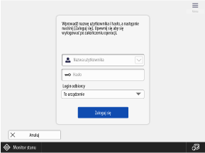 Użytkownicy logują się za pomocą klawiatury wyświetlanej na panelu sterowania, podając nazwę użytkownika i hasło. Jeżeli nazwa użytkownika i hasło składają się wyłącznie z cyfr, możesz skonfigurować ustawienia tak, aby umożliwić logowanie wyłącznie przy użyciu klawiszy numerycznych.