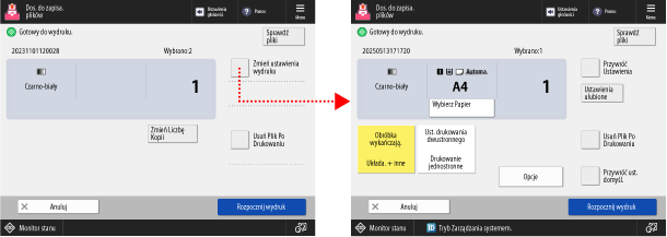 Naciśnij przycisk [Zmień ustawienia wydruku] w prawym górnym rogu ekranu, aby skonfigurować następujące ustawienia: