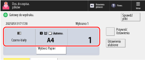 Aktualnie ustawiony papier i liczba wydruków są wyświetlane na środku ekranu. Sprawdź te ustawienia, aby zapewnić prawidłowe drukowanie.