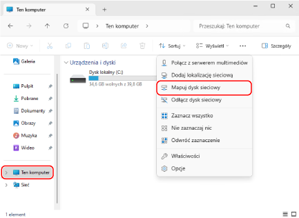 Kliknij prawym przyciskiem myszy przycisk [Ten komputer], a następnie kliknij przycisk [Mapuj dysk sieciowy].