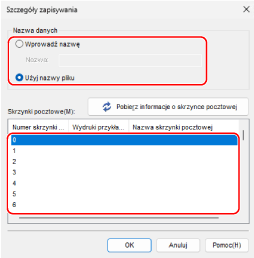 Określ nazwę pliku po zapisaniu i skrzynkę pocztową, która będzie używana jako miejsce zapisu.