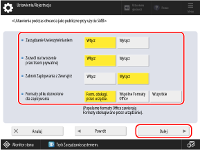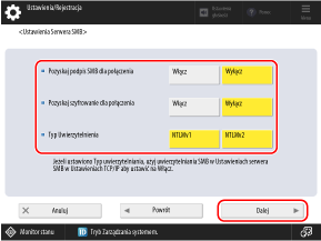 * Gdy ta opcja jest ustawiona na wartość [Włącz], nie jest możliwe połączenie z przestrzenią Zaawansowana przestrzeń z klienckiego systemu operacyjnego, który nie obsługuje komunikacji z szyfrowaniem SMB v3.0.