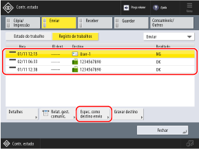 Selecione o item do registo que pretende recuperar e prima [Espec. como destino envio].