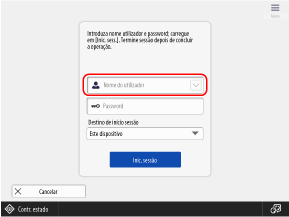 Ecrã [Início]O ecrã de início de sessão é apresentado automaticamente quando se usa uma função que requer autenticação. Depois de iniciar a sessão, o ecrã muda e pode continuar a trabalhar.