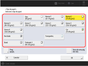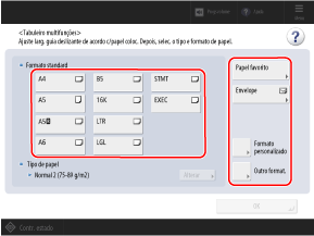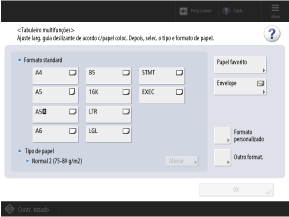 Quando for colocado papel no tabuleiro multifunções, aparece o seguinte ecrã no painel de controlo. Defina o tamanho e o tipo de papel de acordo com o papel colocado.