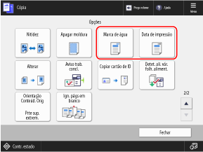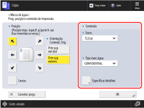 Pode adicionar informações como números de página e data ao copiar. Também pode adicionar uma marca d'água como "CONFIDENTIAL". Também pode especificar uma sequência personalizada para a marca d’água.