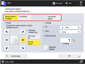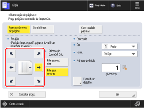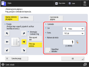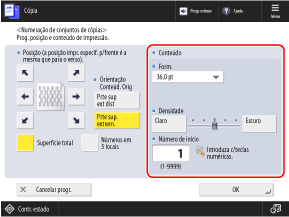 * Não pode selecionar [Superfície total] e [Números em 5 locais] se as configurações estiverem configuradas para adicionar outras informações aos números do conjunto de cópias.