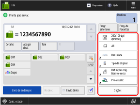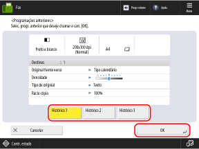 Prima [Progr. anteriores] para recuperar as definições utilizadas anteriormente para o envio de faxes. O destino de envio é aplicado juntamente com as definições recuperadas.