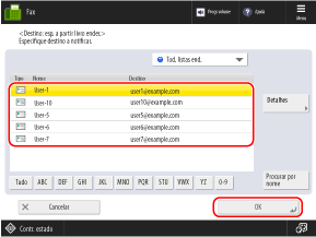 No ecrã do livro de endereços, selecione o destino (endereço de correio eletrónico) a ser definido como destino de notificação e prima [OK].